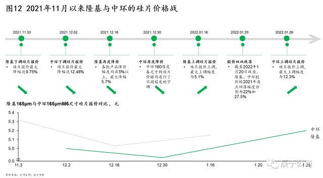 三是競爭壓力下的價格戰(zhàn)。2021年底以來,兩大硅片龍頭先后下調(diào)價格:2021年11月30日,隆基股份宣布下調(diào)硅片報價,最大降幅達9.75%,兩天后,中環(huán)股份也宣布降價,最大降幅達12.48%,而后雙方持續(xù)降價“硝煙四起”,直到2022年初,價格戰(zhàn)才見平息,雙方開始逐步回調(diào)硅片報價(見圖12)。