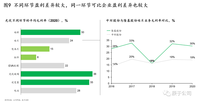 如前文所述,光伏產(chǎn)業(yè)鏈上下游之間相互博弈,這使得上下游各環(huán)節(jié)的盈利差異較大,例如2020年,硅料、光伏玻璃、逆變器等行業(yè)平均毛利率達30%以上,而電池片、組件這一數(shù)字分別僅為15%、8%。即使同一環(huán)節(jié),不同企業(yè)之間的盈利差異也較大:以硅片為例,除2018年以外,隆基股份的硅片毛利率均維持在28%以上的水平,比同期的中環(huán)股份高出10個百分點以上,據(jù)了解,造成這類差異的原因可能是中環(huán)股份的非硅成本、設(shè)備投資要高于隆基股份(見圖9)。