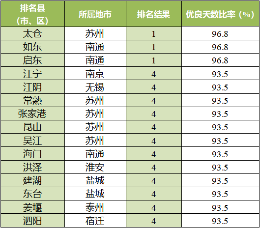 優(yōu)良天數(shù)比率相對(duì)較好的前10位(1-10名)依次是:太倉(cāng)(如東、啟東并列)、江寧(江陰、常熟、張家港、昆山、吳江、海門(mén)、洪澤、建湖、東臺(tái)、姜堰、泗陽(yáng)并列)