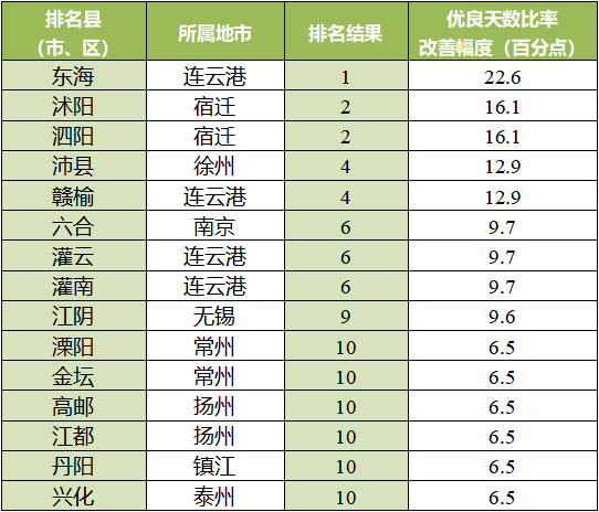 優(yōu)良天數(shù)比率改善幅度相對(duì)較好的前10位(1-10名)依次是:東海、沭陽(yáng)(泗陽(yáng)并列)、沛縣(贛榆并列)、六合(灌云、灌南并列)、江陰、溧陽(yáng)(金壇、高郵、江都、丹陽(yáng)、興化并列)