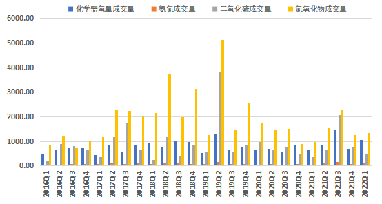 從環(huán)比情況看,化學(xué)需氧量、氨氮、氮氧化物環(huán)比分別增長50.20%、22.53%、5.40%,二氧化硫成交量環(huán)比下降35.52%;從同比情況看,化學(xué)需氧量、氨氮、二氧化硫、氮氧化物成交量同比分別增長54.13%、121.53%、35.07%、36.14%。
