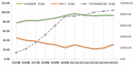 從環(huán)境改善情況來看,水污染物成交量(由化學(xué)需氧量和氨氮成交量構(gòu)成)與III類水質(zhì)以上省控斷面比例呈高度正相關(guān)關(guān)系,顯著性水平小于0.01,皮爾遜相關(guān)系數(shù)為0.964。氣污染物成交量(由二氧化硫和氮氧化物成交量構(gòu)成)與浙江省AQI優(yōu)良率呈高度正相關(guān)關(guān)系,顯著性水平小于0.01,皮爾遜相關(guān)系數(shù)為0.955;氣污染物成交量與PM2.5指數(shù)呈高度負(fù)相關(guān)關(guān)系,顯著性水平小于0.01,皮爾遜相關(guān)系數(shù)為-0.909。