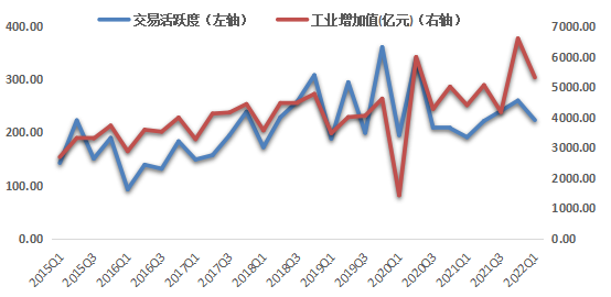 從工業(yè)經(jīng)濟(jì)指標(biāo)來看,浙江省排污權(quán)交易活躍度與工業(yè)增加值(采用浙江省規(guī)模以上工業(yè)增加值各季度增加值,非累計計算數(shù))整體也呈中度正相關(guān)走勢,顯著性水平小于0.01,皮爾遜相關(guān)系數(shù)為0.605。