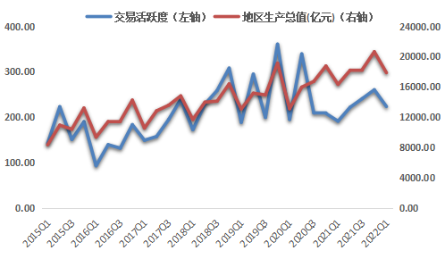 浙江省排污權(quán)交易活躍度與地區(qū)生產(chǎn)總值(采用浙江省地區(qū)生產(chǎn)總值各季度增加值,非累計計算數(shù))整體呈中度正相關(guān)走勢,顯著性水平小于0.01,皮爾遜相關(guān)系數(shù)為0.695。