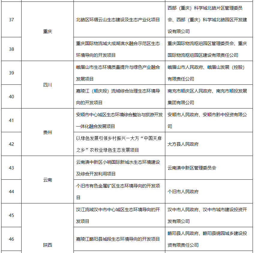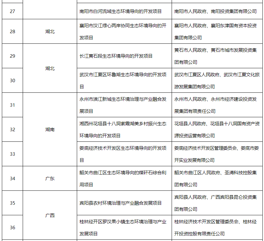 同時(shí),對(duì)于第二批試點(diǎn),3部門還提出了4點(diǎn)要求。?1、認(rèn)真貫徹國(guó)家有關(guān)生態(tài)環(huán)境治理模式創(chuàng)新和環(huán)保產(chǎn)業(yè)發(fā)展要求在試點(diǎn)工作開展過程中積極探索,創(chuàng)新生態(tài)環(huán)境治理項(xiàng)目組織實(shí)施方式,促進(jìn)生態(tài)環(huán)境高水平保護(hù)和區(qū)域經(jīng)濟(jì)高質(zhì)量發(fā)展。省級(jí)生態(tài)環(huán)境、發(fā)展改革部門等試點(diǎn)推進(jìn)單位加強(qiáng)對(duì)試點(diǎn)工作的督促指導(dǎo),對(duì)試點(diǎn)工作中發(fā)現(xiàn)的問題要及時(shí)予以糾正,推進(jìn)試點(diǎn)工作規(guī)范實(shí)施。國(guó)家開發(fā)銀行有關(guān)分行對(duì)符合條件的試點(diǎn)項(xiàng)目,按照精準(zhǔn)施策、市場(chǎng)化運(yùn)作和風(fēng)險(xiǎn)可控原則,發(fā)揮開發(fā)性金融大額中長(zhǎng)期資金優(yōu)勢(shì),統(tǒng)籌考慮經(jīng)濟(jì)效益和環(huán)境效益,在資源配置上予以傾斜,加大支持力度。也就是說,省級(jí)環(huán)保部門和發(fā)改部門要加強(qiáng)指導(dǎo)監(jiān)督,而國(guó)開行有關(guān)分行則要在資源分配上予以傾斜,加大支持。試點(diǎn)實(shí)施單位是試點(diǎn)工作的責(zé)任主體,要嚴(yán)格履行試點(diǎn)實(shí)施承諾,不以試點(diǎn)名義突破現(xiàn)有法律法規(guī)政策等要求,嚴(yán)格落實(shí)招投標(biāo)、政府采購(gòu)、投融資、土地、資源開發(fā)、空間管控、資產(chǎn)處置等各項(xiàng)法規(guī)政策,不以任何形式增加地方政府隱性債務(wù)。采用合法合規(guī)方式選擇具備較強(qiáng)產(chǎn)業(yè)投資運(yùn)營(yíng)能力的項(xiàng)目實(shí)施主體,由一個(gè)主體一體化實(shí)施,確保產(chǎn)業(yè)開發(fā)項(xiàng)目持續(xù)運(yùn)營(yíng)。這一條,是有關(guān)風(fēng)險(xiǎn)防范的條款,告知試點(diǎn)實(shí)施單位要注意控制政府隱性債務(wù),依法開展試點(diǎn)。?3、強(qiáng)化項(xiàng)目收益內(nèi)部反哺機(jī)制試點(diǎn)實(shí)施單位切實(shí)加強(qiáng)公益性生態(tài)環(huán)境治理項(xiàng)目與相關(guān)經(jīng)營(yíng)性產(chǎn)業(yè)開發(fā)項(xiàng)目一體化融合實(shí)施。在項(xiàng)目邊界范圍內(nèi)實(shí)現(xiàn)產(chǎn)業(yè)開發(fā)項(xiàng)目對(duì)生態(tài)環(huán)境治理項(xiàng)目建設(shè)與運(yùn)營(yíng)的持續(xù)性收益反哺。實(shí)施中可適當(dāng)優(yōu)化試點(diǎn)依托項(xiàng)目,加強(qiáng)產(chǎn)業(yè)收益對(duì)生態(tài)環(huán)境治理的反哺力度,減少政府資金投入,力爭(zhēng)實(shí)現(xiàn)政府資金“零投入”。大家知道,EOD項(xiàng)目都是“肥瘦搭配”,這一條就是要求“肥”項(xiàng)目要加強(qiáng)反哺“瘦”項(xiàng)目,從而減少政府資金投入,最好是實(shí)現(xiàn)政府資金“零投入”,應(yīng)該說這才是EOD模式的“初心”。試點(diǎn)實(shí)施單位加強(qiáng)統(tǒng)籌,及時(shí)總結(jié)經(jīng)驗(yàn)做法,探索形成可復(fù)制、可推廣的生態(tài)環(huán)境治理創(chuàng)新模式。按照《關(guān)于開展生態(tài)環(huán)境導(dǎo)向的開發(fā)模式試點(diǎn)定期調(diào)度的通知》要求,試點(diǎn)實(shí)施單位于每季度首月10日前將試點(diǎn)項(xiàng)目季度實(shí)施進(jìn)度情況表報(bào)送生態(tài)環(huán)境部科技與財(cái)務(wù)司。試點(diǎn)期內(nèi)每年12月底前將年度進(jìn)展情況報(bào)告報(bào)請(qǐng)省級(jí)生態(tài)環(huán)境、發(fā)展改革部門審查后,由兩部門上報(bào)生態(tài)環(huán)境部、國(guó)家發(fā)展改革委,抄報(bào)國(guó)家開發(fā)銀行。既然是試點(diǎn),最重要的任務(wù)肯定就是摸索經(jīng)驗(yàn)、探索模式,從而有利于以后的推廣,這一條就是關(guān)于這方面的規(guī)定。總的來看,第二批EOD模式試點(diǎn),國(guó)家的要求并不算很多,還是以探索為主,希望能夠形成可復(fù)制、可推廣的經(jīng)驗(yàn)。所以入選項(xiàng)目也可以盡可能地放開手腳,大膽試驗(yàn)。第一批試點(diǎn)授信額度達(dá)644億元