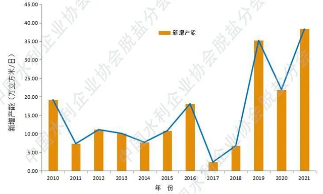 2010-2021年 國內(nèi)已建成海水淡化項目年度產(chǎn)能