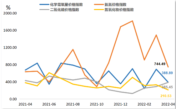 四項排污權(quán)指標:化學(xué)需氧量指數(shù)為388.89 點(對應(yīng)價格15555.73元/噸·年)、氨氮指數(shù)為744.49點(對應(yīng)價格29779.44元/噸·年)、二氧化硫指數(shù)為385.45點(對應(yīng)價格3854.48元/噸·年)、氮氧化物指數(shù)為210.53點(對應(yīng)價格2105.31元/噸·年)。