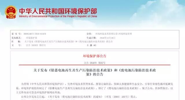 為貫徹《中華人民共和國環(huán)境保護法》,完善環(huán)境技術管理體系,指導污染防治,保障人體健康和生態(tài)安全,引導行業(yè)綠色循環(huán)低碳發(fā)展,環(huán)境保護部組織制定了《鉛蓄電池生產及再生污染防治技術政策》、修訂了《廢電池污染防治技術政策》?,F予公布,供參照執(zhí)行。以上文件內容可登錄環(huán)境保護部網站查詢。