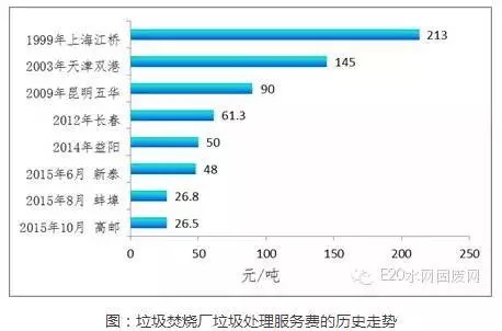 隨著中國城市化的加速,城市人口大幅增加,城市垃圾量也急劇增多,當(dāng)前,城市生活垃圾累積堆存量已達(dá)70億噸,而全國垃圾年產(chǎn)量仍以每年8%-10%的速度增長(zhǎng),與GDP增速匹敵,預(yù)計(jì)截止到2020年,城市垃圾產(chǎn)量將達(dá)約3.23億噸。垃圾焚燒發(fā)電是解決“垃圾圍城”的重要方式之一。由于在實(shí)施垃圾焚燒發(fā)電項(xiàng)目前期投資金額大,故一般采取PPP/BOT方式進(jìn)行,項(xiàng)目投資回收主要依靠上網(wǎng)發(fā)電收入及垃圾處理服務(wù)費(fèi)補(bǔ)貼收入。近16年來,垃圾處理的政府補(bǔ)貼費(fèi)用呈現(xiàn)大幅下跌狀態(tài)(如下圖)。