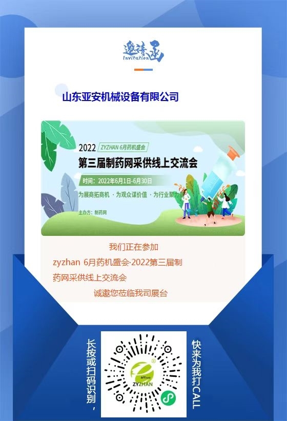 由制藥網(wǎng)舉辦的zyzhan 6月藥機(jī)盛會——2022第三屆制藥網(wǎng)采供線上交流會(在線展會),將于6月1日上午10:00正式拉開帷幕。屆時,山東亞安也將攜大批產(chǎn)品亮相展會,敬請期待!