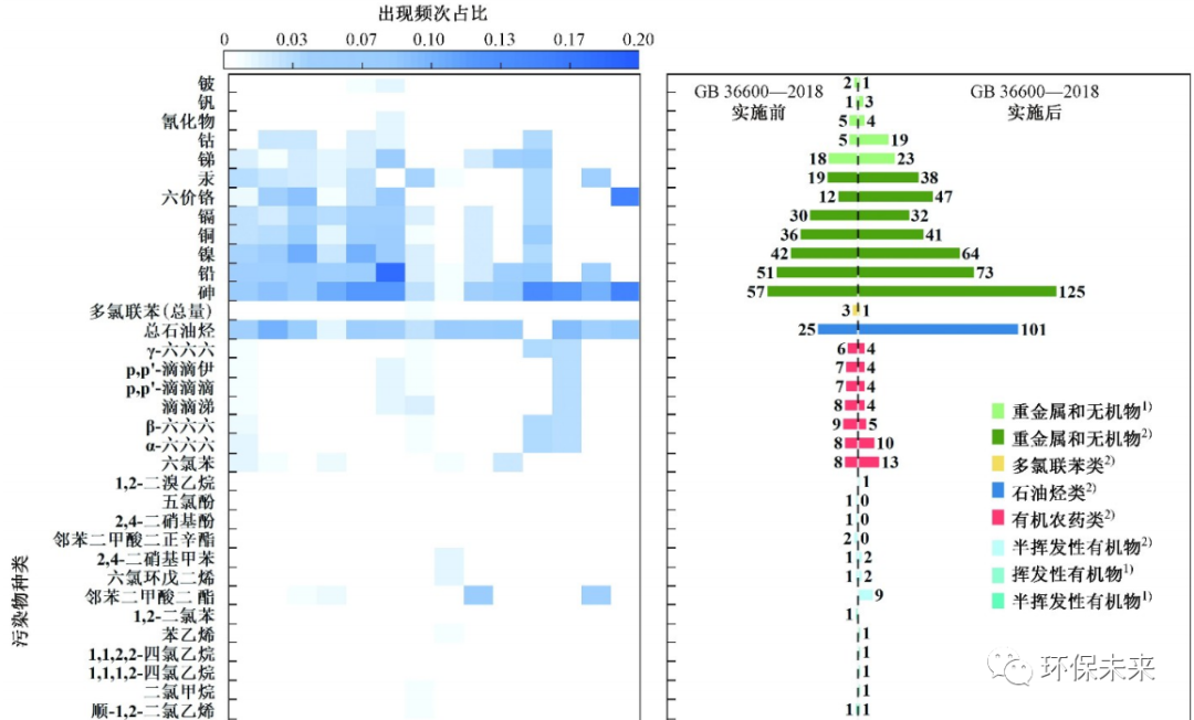 14 種行業(yè)企業(yè)特征污染物的出現(xiàn)頻次占比分布 (見圖 2) 顯示,在收集到的 537 個(gè)污染場(chǎng)地中,共出現(xiàn) 60 種污染物. 化學(xué)工業(yè)場(chǎng)地中特征污染物多樣,幾乎涵蓋了 60 種污染物中常見的污染物,包括苯系物、多環(huán)芳烴、重金屬、農(nóng)藥及石油烴等,這與已有研究結(jié)果[25-26] 一致. 金屬制品的主要污染物是 Ni、Cr6+、Cu、Cd、As 和 Pb 等重金屬,其中 Ni、Cr6+占比較大. 鋼鐵行業(yè)和金屬表面處理及熱處理加工場(chǎng)地涉及金屬熱處理、表面處理、機(jī)械加工等工藝,粉塵、煙塵等污染物的不當(dāng)處置導(dǎo)致 Pb、Cu、As、Zn 和 Ni 等重金屬的產(chǎn)生[27-28]. 黑色冶煉的主要污染物是苯并 [a] 芘和重金屬 As,有色冶煉的主要污染物是重金屬 As 和 Ni. 金屬冶煉和壓延加工業(yè)場(chǎng)地中,含 As 化合物和焦炭等在工藝過(guò)程中的使用,導(dǎo)致 As 和多環(huán)芳烴等污染物的產(chǎn)生[29-30]. 電器制造的主要污染物是重金屬 Pb;其余行業(yè)的特征污染物分布比較零散.同時(shí),在這 14 類行業(yè)中除造紙行業(yè)沒有統(tǒng)計(jì)到苯并 [a] 芘以外,其他行業(yè)均出現(xiàn)了多環(huán)芳烴類為主的半揮發(fā)性有機(jī)物,包括苯并 [a] 芘、二苯并 [a,h] 蒽、苯并 [b] 熒蒽、苯并 [a] 蒽、茚并 [1,2,3-cd] 芘和苯并[k] 熒蒽. 值得注意的是,重金屬污染物在不同行業(yè)的分布也很普遍,主要是 As、Pb、Ni、Cu、Cd 和 Cr6+,這與傳統(tǒng)的“五毒元素”相比,重金屬 Ni 替代了 Hg. 除此之外,苯系物為主的揮發(fā)性有機(jī)物和總石油烴類的污染物在不同行業(yè)中也有一定占比. 總之,在我國(guó)污染場(chǎng)地開展修復(fù)與管控工作中,多環(huán)芳烴類為主的半揮發(fā)性有機(jī)物作為各行業(yè)中突出的污染物質(zhì),是我國(guó)未來(lái)場(chǎng)地土壤環(huán)境治理工作的重點(diǎn).2.3 場(chǎng)地污染物管控指標(biāo)的變化特點(diǎn)與大氣和水的污染防治工作相比,我國(guó)建設(shè)用地土壤污染防治工作正處于初步發(fā)展階段. 原國(guó)家環(huán)境保護(hù)總局于 2004 年發(fā)布了《關(guān)于切實(shí)做好企業(yè)搬遷過(guò)程中環(huán)境污染防治工作的通知》,標(biāo)志著我國(guó)工業(yè)污染場(chǎng)地環(huán)境管理的起步. 經(jīng)過(guò) 10 多年的探索和實(shí)踐,建設(shè)用地普適性的風(fēng)險(xiǎn)調(diào)查評(píng)估技術(shù)導(dǎo)則類標(biāo)準(zhǔn)和地方政府出臺(tái)的風(fēng)險(xiǎn)評(píng)估技術(shù)導(dǎo)則以及篩選值標(biāo)準(zhǔn)等相互補(bǔ)充,初步形成了包含場(chǎng)地調(diào)查、評(píng)估、修復(fù)管控與效果評(píng)估多環(huán)節(jié)的建設(shè)用地全過(guò)程土壤環(huán)境保護(hù)的標(biāo)準(zhǔn)體系. 在 GB 36600?2018 發(fā)布之前,各省份污染場(chǎng)地在進(jìn)行修復(fù)管控時(shí)主要參考HJ 350?2007《展覽會(huì)用地土壤環(huán)境質(zhì)量評(píng)價(jià)標(biāo)準(zhǔn)》和 DB 11/T 811?2011《場(chǎng)地土壤環(huán)境風(fēng)險(xiǎn)評(píng)價(jià)篩選值》等起步較早和先行的地方管理標(biāo)準(zhǔn)為主體的標(biāo)準(zhǔn)文本;在 GB 36600?2018 發(fā)布之后,各省份污染場(chǎng)地在進(jìn)行修復(fù)管控時(shí)則主要參考該標(biāo)準(zhǔn),并結(jié)合一些地方標(biāo)準(zhǔn)開展場(chǎng)地管理工作. 這些標(biāo)準(zhǔn)中的篩選值和管制值提供了污染場(chǎng)地需要關(guān)注的污染物種類,明確了場(chǎng)地修復(fù)時(shí)污染物的管控指標(biāo),并將污染物清單區(qū)分為基本項(xiàng)目和其他項(xiàng)目,涵蓋了無(wú)機(jī)污染物、揮發(fā)性有機(jī)污染物、半揮發(fā)性有機(jī)污染物和農(nóng)藥/多氯聯(lián)苯及其他不同化學(xué)物質(zhì)等.GB 36600?2018 作為我國(guó)污染場(chǎng)地修復(fù)治理領(lǐng)域的重要管理標(biāo)準(zhǔn),其頒布實(shí)施以來(lái)發(fā)揮著越來(lái)越重要的作用. 為了分析該標(biāo)準(zhǔn)實(shí)施后工業(yè)污染場(chǎng)地污染物管控指標(biāo)的演變情況,以 GB 36600?2018 正式實(shí)施日期即 2018 年 8 月 1 日為分界線,嘗試分析GB 36600?2018 實(shí)施前后工業(yè)污染場(chǎng)地污染物管控指標(biāo)出現(xiàn)頻次的變化,并探討其變化規(guī)律. 由圖 2 可知,GB 36600?2018 實(shí)施后污染物管控指標(biāo)的出現(xiàn)頻次較 GB 36600?2018 頒布前總體增加,整體呈現(xiàn)左右不對(duì)稱的態(tài)勢(shì). 從絕對(duì)增量來(lái)看,出現(xiàn)頻次增加明顯的有苯并 [a] 芘、總石油烴、砷、二苯并 [a,h] 蒽、苯并 [b] 熒蒽、苯并 [a] 蒽、六價(jià)鉻等污染物,這與收集案例的年份和數(shù)量有關(guān). 從相對(duì)增量來(lái)看,出現(xiàn)頻次增加特別明顯的是溶劑類揮發(fā)性和半揮發(fā)性有機(jī)物,包括苯系物、多環(huán)芳烴和總石油烴等. 苯、甲苯、乙苯、二甲苯和苯乙烯等統(tǒng)稱為苯系物,具有持久性、親脂性和高毒性等特征,對(duì)人類健康和生態(tài)環(huán)境具有較強(qiáng)的毒性和危害性[31-33]. 同時(shí),部分多環(huán)芳烴作為光化學(xué)煙霧的重要前體物,其反應(yīng)活性較高,對(duì)霧霾天氣中細(xì)顆粒物的生成及其二次污染具有重要影響[34].總石油烴污染物遷移能力較強(qiáng),具有毒性和“三致”危害,可通過(g