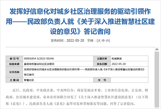 《意見(jiàn)》提出,加強(qiáng)智慧社區(qū)基礎(chǔ)設(shè)施建設(shè)改造。推進(jìn)小區(qū)智能感知設(shè)施建設(shè),擴(kuò)大智能感知設(shè)施和技術(shù)在生活垃圾處理等領(lǐng)域應(yīng)用。《關(guān)于深入推進(jìn)智慧社區(qū)建設(shè)的意見(jiàn)》全文如下:關(guān)于深入推進(jìn)智慧社區(qū)建設(shè)的意見(jiàn)智慧社區(qū)是充分應(yīng)用大數(shù)據(jù)、云計(jì)算、人工智能等信息技術(shù)手段,整合社區(qū)各類(lèi)服務(wù)資源,打造基于信息化、智能化管理與服務(wù)的社區(qū)治理新形態(tài)。為充分運(yùn)用現(xiàn)代信息技術(shù),不斷提升城鄉(xiāng)社區(qū)治理服務(wù)智慧化、智能化水平,根據(jù)《中共中央 國(guó)務(wù)院關(guān)于加強(qiáng)基層治理體系和治理能力現(xiàn)代化建設(shè)的意見(jiàn)》、《國(guó)務(wù)院辦公廳關(guān)于印發(fā)〈“十四五”城鄉(xiāng)社區(qū)服務(wù)體系建設(shè)規(guī)劃〉的通知》等文件要求,現(xiàn)就推進(jìn)智慧社區(qū)建設(shè)提出如下意見(jiàn):(一)指導(dǎo)思想。以習(xí)近平新時(shí)代中國(guó)特色社會(huì)主義思想為指導(dǎo),深入學(xué)習(xí)貫徹習(xí)近平總書(shū)記關(guān)于網(wǎng)絡(luò)強(qiáng)國(guó)的重要思想和基層治理的重要論述精神,貫徹落實(shí)黨的十九大和十九屆歷次全會(huì)精神,立足新發(fā)展階段,完整、準(zhǔn)確、全面貫徹新發(fā)展理念,服務(wù)加快構(gòu)建新發(fā)展格局,深化物聯(lián)網(wǎng)、大數(shù)據(jù)、云計(jì)算和人工智能等信息技術(shù)應(yīng)用,按照智慧城市和現(xiàn)代社區(qū)的發(fā)展要求,依托社區(qū)數(shù)字化平臺(tái)和線下社區(qū)服務(wù)機(jī)構(gòu),集約建設(shè)便民惠民智慧服務(wù)圈,提供線上線下相融合的社區(qū)生活服務(wù)、社區(qū)治理及公共服務(wù)、智能小區(qū)等服務(wù),讓社區(qū)更加和諧有序、服務(wù)更有溫度,不斷增強(qiáng)居民獲得感、幸福感、安全感。——堅(jiān)持黨的全面領(lǐng)導(dǎo)。把堅(jiān)持和加強(qiáng)黨的全面領(lǐng)導(dǎo)貫穿于智慧社區(qū)建設(shè)的全過(guò)程和各方面,確保智慧社區(qū)建設(shè)的正確方向。——堅(jiān)持以人民為中心。始終把滿足人民對(duì)美好生活的向往作為出發(fā)點(diǎn)和落腳點(diǎn),拓展應(yīng)用服務(wù)場(chǎng)景,讓數(shù)據(jù)多跑路、群眾少跑腿。——堅(jiān)持統(tǒng)籌規(guī)劃。強(qiáng)化系統(tǒng)觀念,整合現(xiàn)有資源,推動(dòng)系統(tǒng)集成、數(shù)據(jù)共享和業(yè)務(wù)協(xié)同,打破信息壁壘,為基層賦能減負(fù)。——堅(jiān)持需求導(dǎo)向。立足社區(qū)資源稟賦和居民需求,強(qiáng)化系統(tǒng)建設(shè)的實(shí)用性、前瞻性和可擴(kuò)展性,突出以城帶鄉(xiāng)、急用先行、梯次推進(jìn)、迭代更新。——堅(jiān)持安全發(fā)展。加強(qiáng)智慧社區(qū)網(wǎng)絡(luò)和數(shù)據(jù)安全管理,強(qiáng)化關(guān)鍵信息基礎(chǔ)設(shè)施防護(hù),依法保護(hù)居民信息安全和個(gè)人隱私。(三)建設(shè)目標(biāo)。到2025年,基本構(gòu)建起網(wǎng)格化管理、精細(xì)化服務(wù)、信息化支撐、開(kāi)放共享的智慧社區(qū)服務(wù)平臺(tái),初步打造成智慧共享、和睦共治的新型數(shù)字社區(qū),社區(qū)治理和服務(wù)智能化水平顯著提高,更好感知社會(huì)態(tài)勢(shì)、暢通溝通渠道、輔助決策施政、方便群眾辦事。(一)集約建設(shè)智慧社區(qū)平臺(tái)。充分依托已有平臺(tái),因地制宜推進(jìn)智慧社區(qū)綜合信息平臺(tái)建設(shè),推動(dòng)部署在不同層級(jí)、不同部門(mén)的各類(lèi)社區(qū)信息系統(tǒng)與智慧社區(qū)綜合信息平臺(tái)聯(lián)網(wǎng)對(duì)接或向其遷移集成。依法向社區(qū)下放政務(wù)服務(wù)審批受理權(quán)限,擴(kuò)大社區(qū)政務(wù)服務(wù)事項(xiàng)網(wǎng)上受理、辦理數(shù)量和種類(lèi),拓展政務(wù)事項(xiàng)查詢(xún)、辦理、反饋功能。完善電子政務(wù)服務(wù)流程,實(shí)行“前臺(tái)一口受理、后臺(tái)分工協(xié)同”運(yùn)行模式,推動(dòng)跨部門(mén)業(yè)務(wù)協(xié)同、信息實(shí)時(shí)共享。以設(shè)區(qū)的市為單位,大幅度優(yōu)化精簡(jiǎn)部署在社區(qū)的業(yè)務(wù)應(yīng)用系統(tǒng),整合功能相對(duì)單一、相近或重復(fù)的辦公類(lèi)、管理類(lèi)、學(xué)習(xí)類(lèi)等APP,整治“指尖上的形式主義”。推進(jìn)智慧社區(qū)綜合信息平臺(tái)與城市運(yùn)行管理服務(wù)平臺(tái)、智慧物業(yè)管理服務(wù)平臺(tái)、智能家庭終端互聯(lián)互通和融合應(yīng)用,提供一體化管理和服務(wù)。(二)拓展智慧社區(qū)治理場(chǎng)景。依托智慧社區(qū)綜合信息平臺(tái)建立健全民情反饋、風(fēng)險(xiǎn)研判、應(yīng)急響應(yīng)、輿情應(yīng)對(duì)機(jī)制,提升社區(qū)全周期管理水平。全面推進(jìn)“互聯(lián)網(wǎng)+社區(qū)黨建”,推動(dòng)社區(qū)黨建工作和黨員管理服務(wù)信息化,做好網(wǎng)上群眾工作。優(yōu)化社區(qū)網(wǎng)格管理平臺(tái),推行“社區(qū)輸入+網(wǎng)上推送+部門(mén)響應(yīng)”工作模式,健全即時(shí)響應(yīng)機(jī)制及時(sh