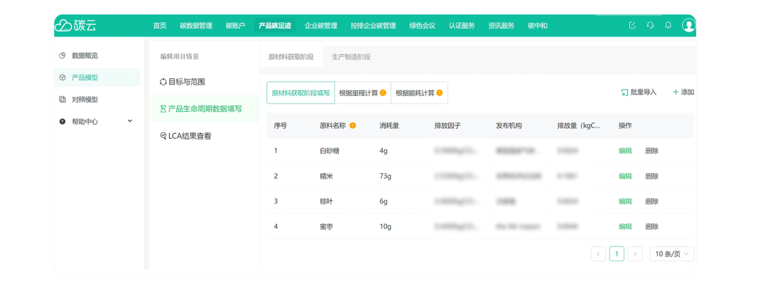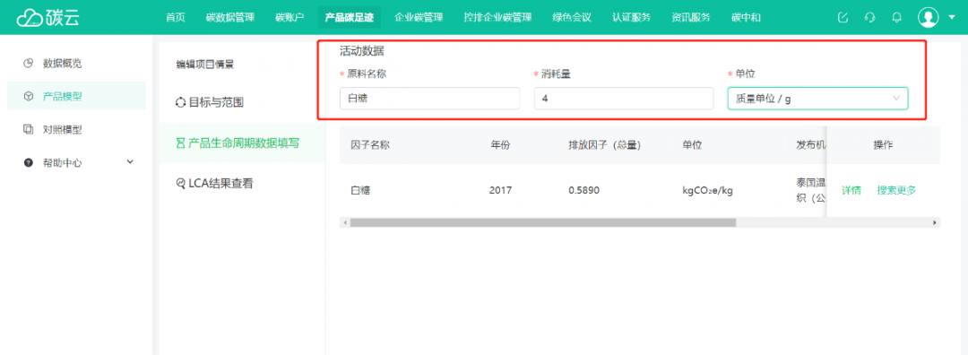 【產(chǎn)品生命周期數(shù)據(jù)填寫】頁面,添加各類原材料的活動數(shù)據(jù),包括原料名稱、消耗量和單位。