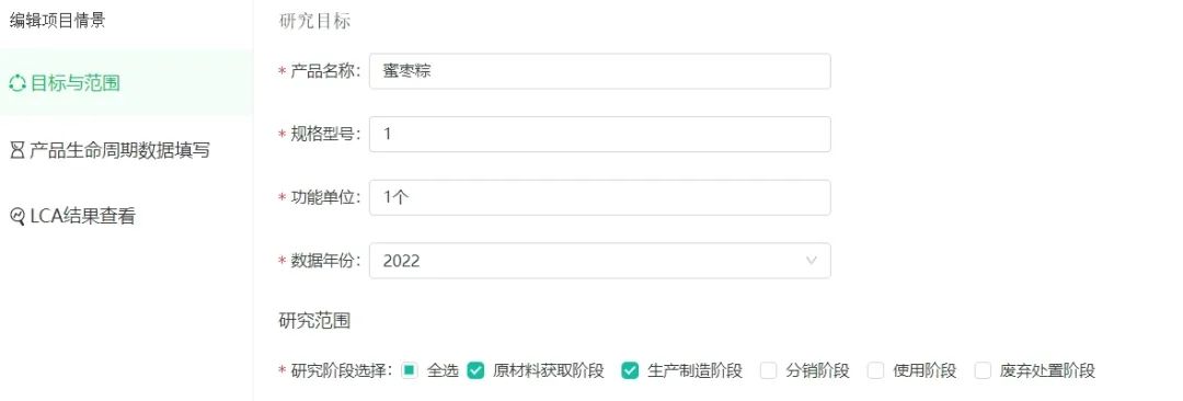 選擇【產(chǎn)品碳足跡】板塊,填寫產(chǎn)品的基本信息,并選擇你要研究的范圍