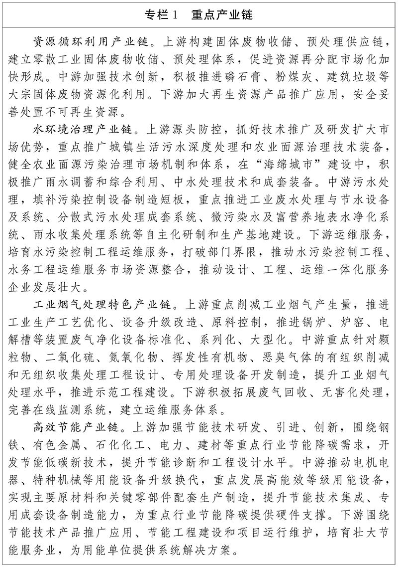 結(jié)合我省資源優(yōu)勢、市場優(yōu)勢,立足現(xiàn)有產(chǎn)業(yè)基礎(chǔ),著眼未來產(chǎn)業(yè)發(fā)展,服務(wù)于綠色發(fā)展重大需求,發(fā)揮上游技術(shù)研發(fā)引領(lǐng)和資源供給優(yōu)勢,提升中游節(jié)能環(huán)保技術(shù)裝備和技術(shù)服務(wù)競爭力,保障下游技術(shù)應(yīng)用和市場服務(wù)質(zhì)量和水平,重點(diǎn)打造資源循環(huán)利用產(chǎn)業(yè)鏈、水環(huán)境治理產(chǎn)業(yè)鏈、工業(yè)煙氣處理特色產(chǎn)業(yè)鏈、高效節(jié)能產(chǎn)業(yè)鏈、綠色建筑建材產(chǎn)業(yè)鏈,做大做強(qiáng)優(yōu)勢環(huán)保產(chǎn)業(yè)。