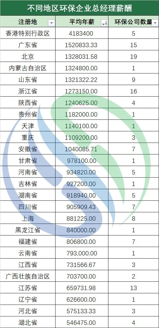 再?gòu)?strong style="margin: 0px;padding: 0px;outline: 0px;box-sizing: border-box !important;overflow-wrap: break-word !important;">企業(yè)注冊(cè)地方面來(lái)看,中國(guó)水網(wǎng)所統(tǒng)計(jì)的143家環(huán)保上市公司分別來(lái)自26個(gè)省、市、自治區(qū)和特別行政區(qū)。其中,注冊(cè)地位于香港的環(huán)保上市公司總經(jīng)理平均年薪約為418.34萬(wàn)元,遠(yuǎn)高于其它地區(qū),奪得地區(qū)冠軍。廣東、北京緊隨其后,分別以152.08萬(wàn)元與132.8萬(wàn)元位列第二、三名。