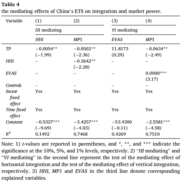 2.中國的ETS通過降低高碳行業(yè)的橫向整合水平,降低企業(yè)市場支配力;