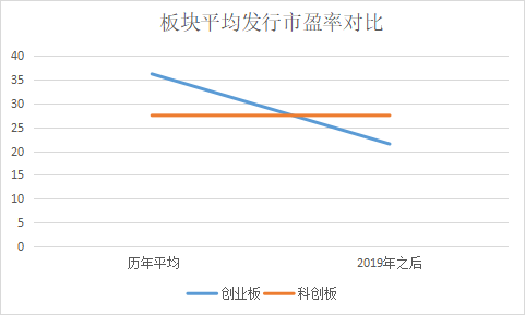 從兩個(gè)板塊對(duì)比看,科創(chuàng)板企業(yè)的平均發(fā)行市盈率約為27.5,創(chuàng)業(yè)板企業(yè)的的平均發(fā)行市盈率約為36.2,比科創(chuàng)板高35.2%。考慮到科創(chuàng)板企業(yè)都是2019年之后上市的,以2019年之后上市企業(yè)統(tǒng)計(jì),則創(chuàng)業(yè)板企業(yè)的平均發(fā)行市盈率約為21.5,比科創(chuàng)板企業(yè)低了將近21%。