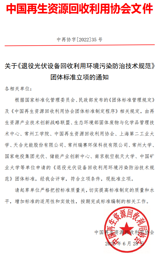 2022年6月28日,中國再生資源回收利用協(xié)會發(fā)布通知,明確《退役光伏設(shè)備回收利用環(huán)境污染防治技術(shù)規(guī)范》符合立項條件,批準(zhǔn)立項。中國再生資源回收利用協(xié)會要求起草單位嚴(yán)格把控標(biāo)準(zhǔn)質(zhì)量關(guān),切實提高標(biāo)準(zhǔn)制定的質(zhì)量和水平,增加標(biāo)準(zhǔn)的適用性和實效性,按期完成標(biāo)準(zhǔn)編制的相關(guān)工作。