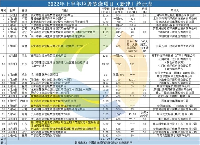 ▼2022年上半年垃圾焚燒項目(新建)統(tǒng)計表(注:標(biāo)黃為焚燒+協(xié)同處置項目,共計6個)