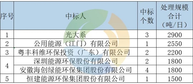 從中標(biāo)企業(yè)上看,26個項目共計17個企業(yè)/集團(tuán)中標(biāo)。按處理規(guī)模統(tǒng)計,前五名企業(yè)排名如下(注:深能環(huán)保和海創(chuàng)綠能并列第四):