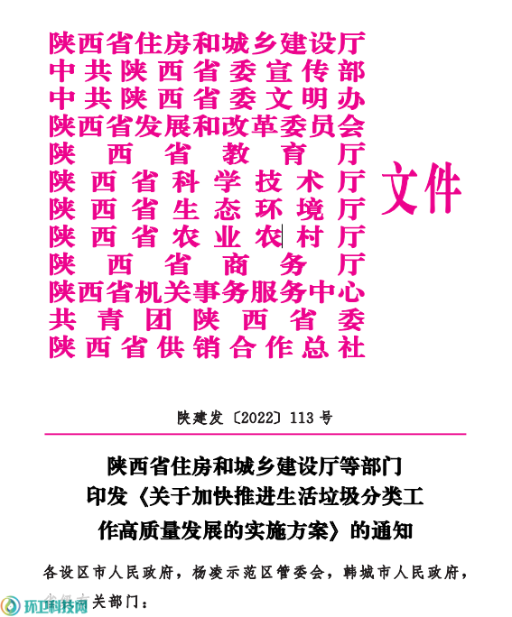 陜西省住房和城鄉(xiāng)建設(shè)廳等部門印發(fā)《關(guān)于加快推進(jìn)生活垃圾分類工作高質(zhì)量發(fā)展的實(shí)施方案》的通知