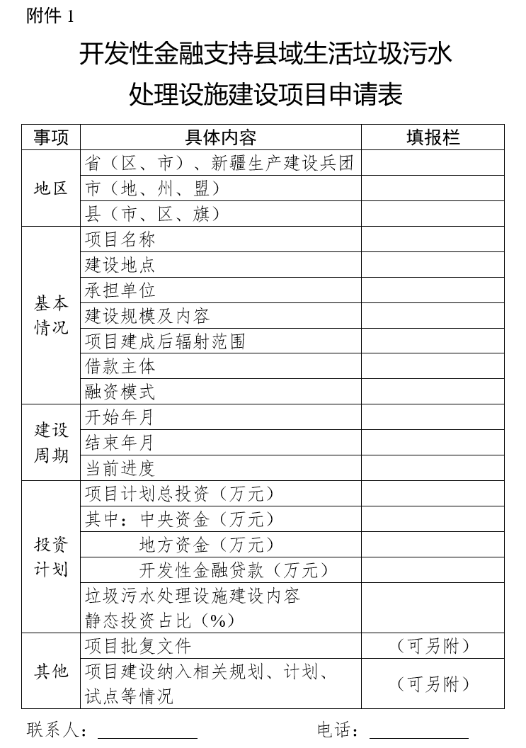 住房和城鄉(xiāng)建設部村鎮(zhèn)建設司胡建坤 010—58934706,58933123(傳)黃 瓊 010—68306870,88308848(傳)1.開發(fā)性金融支持縣域生活垃圾污水處理設施建設項目申請表2.開發(fā)性金融支持縣域生活垃圾污水處理設施建設項目進展表