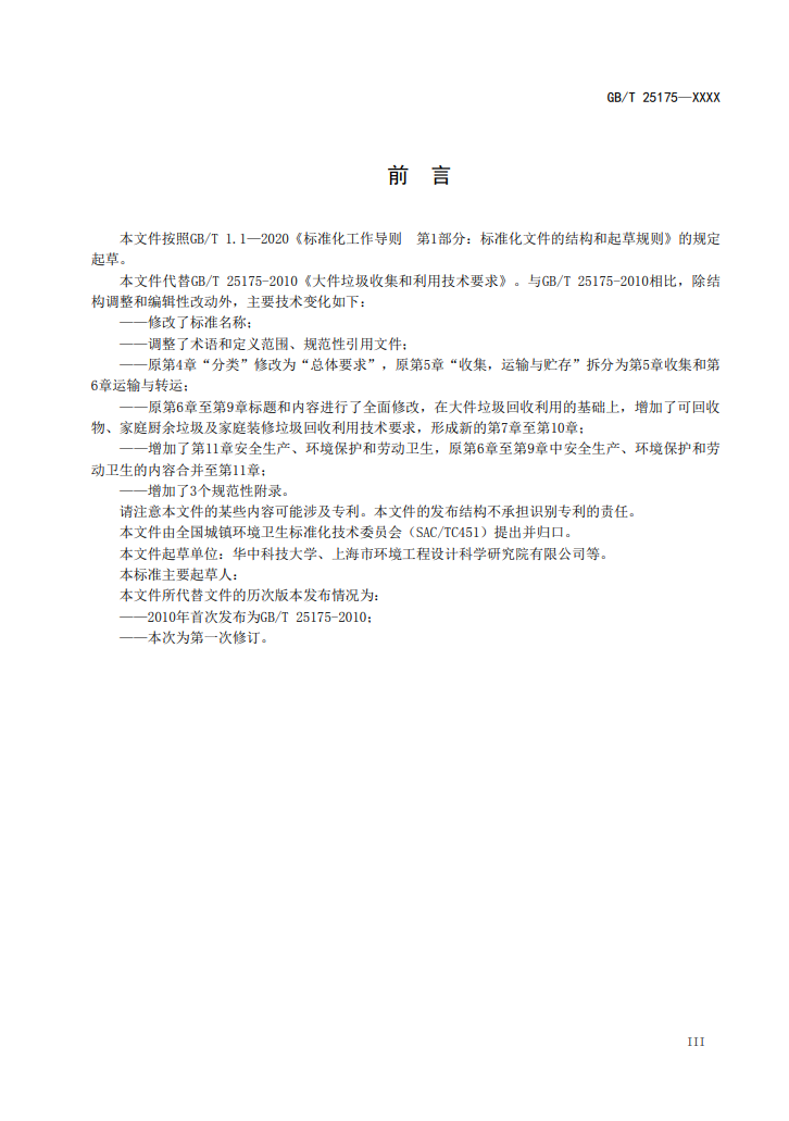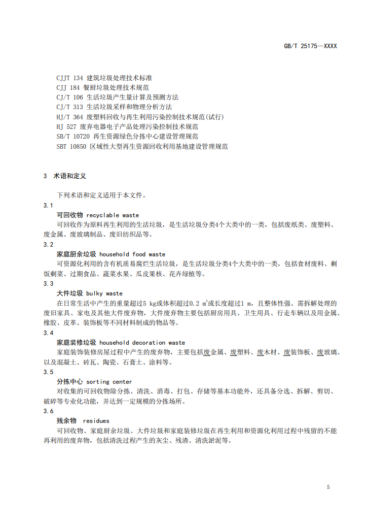 由于標(biāo)準(zhǔn)系由大件垃圾國標(biāo)修訂而來,因此首先在術(shù)語部分進(jìn)行了修改,對(duì)“可回收物”、“家庭廚余垃圾”、“大件垃圾”、“家庭裝修垃圾”、“分揀中心”和“殘余物”六項(xiàng)做出定義。