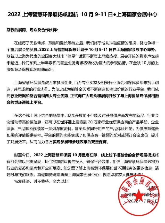 時至今日,2022上海智慧環(huán)保展10月重啟在即,線上線下相融合的全新觀展模式終有機會得以呈現(xiàn),我們將加倍宣傳的投入,確保平臺效果,相信上海智慧環(huán)保展必將為行業(yè)的復(fù)蘇和振興翻開全新篇章。如您需了解上海智慧環(huán)保展和世環(huán)通服務(wù)的更多信息,請隨時與我們聯(lián)系。真誠期待與您再聚上海國家會展中心!祝愿您和家人健康平安!