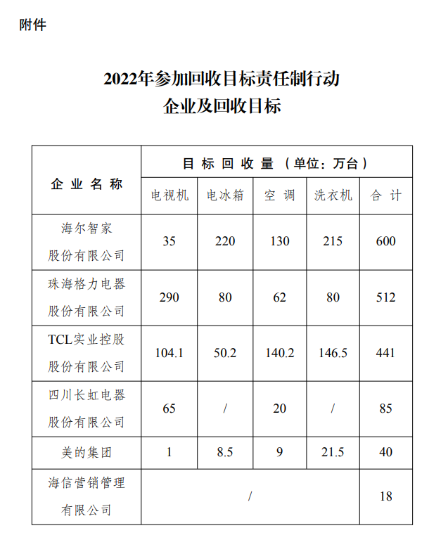 2022年5月,國家發(fā)展改革委辦公廳、工業(yè)和信息化部辦公廳、生態(tài)環(huán)境部辦公廳印發(fā)《關(guān)于做好2022年家電生產(chǎn)企業(yè)回收目標責任制行動有關(guān)工作的通知》,確定了6家開展2022年回收目標責任制行動的企業(yè)(見附件)。