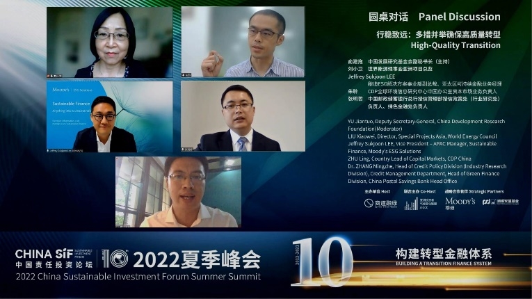 第二輪圓桌對(duì)話環(huán)節(jié)圍繞“多措并舉確保高質(zhì)量轉(zhuǎn)型”展開,由中國發(fā)展研究基金會(huì)副秘書長俞建拖主持。世界能源理事會(huì)亞洲項(xiàng)目總監(jiān)劉小衛(wèi),穆迪ESG解決方案事業(yè)部副總裁、亞太區(qū)可持續(xù)金融業(yè)務(wù)經(jīng)理Jeffrey Sukjoon LEE,CDP全球環(huán)境信息研究中心中國辦公室資本市場(chǎng)業(yè)務(wù)負(fù)責(zé)人朱聆,中國郵政儲(chǔ)蓄銀行總行授信管理部授信政策處(行業(yè)研究處)負(fù)責(zé)人與綠色金融處負(fù)責(zé)人張明哲博士就高質(zhì)量轉(zhuǎn)型背景下,可持續(xù)金融存在的短板及其原因、以及潛在的解決方案展開了熱烈討論。Jeffrey指出,轉(zhuǎn)型金融對(duì)推動(dòng)亞太地區(qū)的可持續(xù)發(fā)展至關(guān)重要。如果所在行業(yè)減排難度大的發(fā)行人希望進(jìn)入可持續(xù)金融市場(chǎng)獲得可持續(xù)融資,他們就需要可信的轉(zhuǎn)型計(jì)劃、戰(zhàn)略和指標(biāo)。雖然我們看到企業(yè)在溫室氣體排放的信息披露方面取得了進(jìn)步,但在標(biāo)準(zhǔn)化和覆蓋范圍方面仍有很多工作要做。