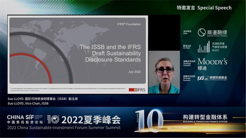 隨后,國際可持續(xù)準(zhǔn)則理事會(huì)(ISSB)副主席Sue LLOYD做了特邀發(fā)言。她介紹,ISSB由國際財(cái)務(wù)報(bào)告準(zhǔn)則(IFRS)基金會(huì)在2021年第26屆聯(lián)合國氣候變化大會(huì)上發(fā)起,旨在制定統(tǒng)一的可持續(xù)發(fā)展報(bào)告準(zhǔn)則。她分享了ISSB近期發(fā)布的兩份可持續(xù)披露準(zhǔn)則文件征求意見稿的主要內(nèi)容,即《國際財(cái)務(wù)報(bào)告可持續(xù)披露準(zhǔn)則第1號(hào)——可持續(xù)相關(guān)財(cái)務(wù)信息披露一般要求(征求意見稿)》和《國際財(cái)務(wù)報(bào)告可持續(xù)披露準(zhǔn)則第2號(hào)——氣候相關(guān)披露(征求意見稿)》,并呼吁大家在七月底之前積極提供反饋。