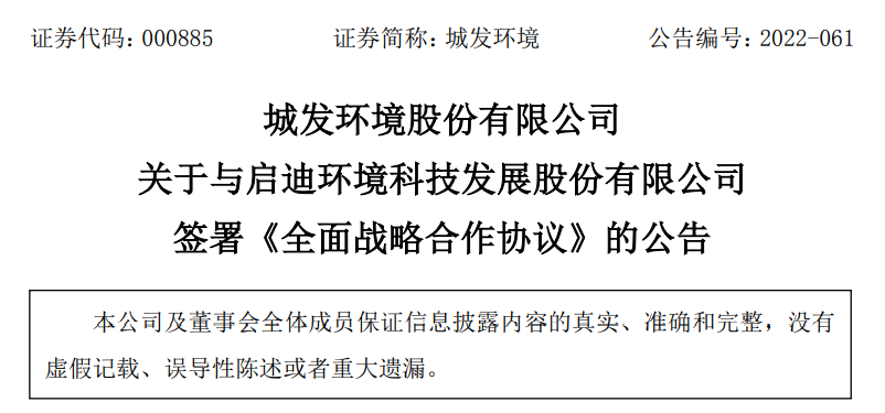 同時(shí),另一則公告顯示,城發(fā)環(huán)境與啟迪環(huán)境簽署的戰(zhàn)略框架性協(xié)議。合作內(nèi)容、合作機(jī)制與合作期限等事項(xiàng)的具體實(shí)施尚存在不確定性,具體的項(xiàng)目合作協(xié)議或項(xiàng)目開展方案尚需雙方進(jìn)一步協(xié)商確定。公告顯示,基于城發(fā)環(huán)境在環(huán)保項(xiàng)目建設(shè)、區(qū)域市場拓展、環(huán)保技術(shù)研發(fā)及人員交流等方面與啟迪環(huán)境已經(jīng)開展了深入、全面的合作,具備良好的合作基礎(chǔ),為延續(xù)雙方友好合作關(guān)系、充分發(fā)揮雙方在環(huán)保、能源領(lǐng)域的發(fā)展優(yōu)勢,公司與啟迪環(huán)境共同簽署了《全面戰(zhàn)略合作協(xié)議》,以進(jìn)一步推動雙方交流合作。