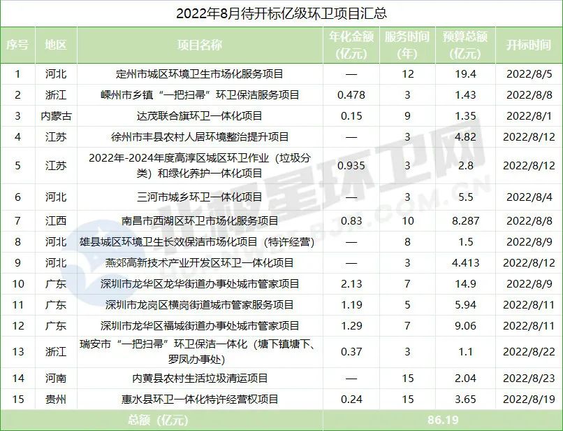 除此之外,北極星環(huán)衛(wèi)網(wǎng)還統(tǒng)計(jì)了8月待開標(biāo)的億級(jí)環(huán)衛(wèi)項(xiàng)目,預(yù)算總額約86.2億元,主要分布在華北地區(qū)和東南地區(qū)。