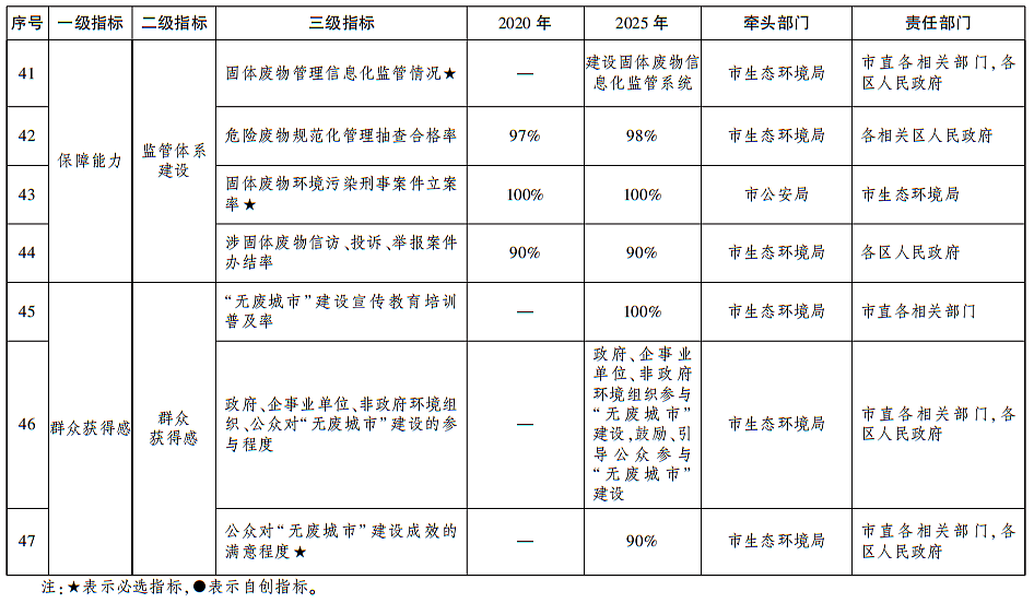 “無(wú)廢城市”是以創(chuàng)新、協(xié)調(diào)、綠色、開放、共享的新發(fā)展理念為引領(lǐng),通過推動(dòng)形成綠色發(fā)展方式和生活方式,強(qiáng)化固體廢物源頭減量,提升廢棄物資源綜合循環(huán)利用水平,有效保障無(wú)害化處置能力,最大限度降低固體廢物填埋量,是一種先進(jìn)的城市管理理念。具體建設(shè)目標(biāo)是:到2025年,全市工業(yè)固體廢物產(chǎn)生強(qiáng)度較快下降,主要農(nóng)業(yè)廢棄物接近全量利用,生活垃圾分類基本實(shí)現(xiàn)全覆蓋,建筑垃圾綜合利用水平顯著提升,危險(xiǎn)廢物得到安全管控,固體廢物管理信息“一張網(wǎng)”初步建成,以汽車、鋼鐵、石化、建材、食品等為主導(dǎo)的產(chǎn)業(yè)“無(wú)廢”模式初步形成,“無(wú)廢”理念深入人心。