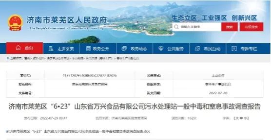 并且前幾天,山東省濟(jì)南市萊蕪區(qū)公布了“6?23”山東省萬興食品有限公司污水處理站一般中毒和窒息事故調(diào)查報(bào)告。