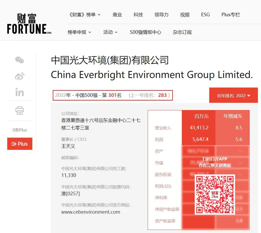 去年,由于業(yè)績(jī)出色,光大環(huán)境還首次躋身《財(cái)富》中國(guó)500強(qiáng),位列第283位,成為榜單中排名最高的環(huán)境企業(yè)。