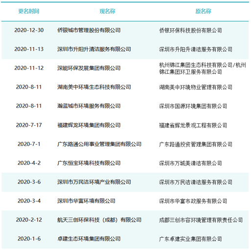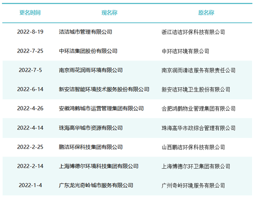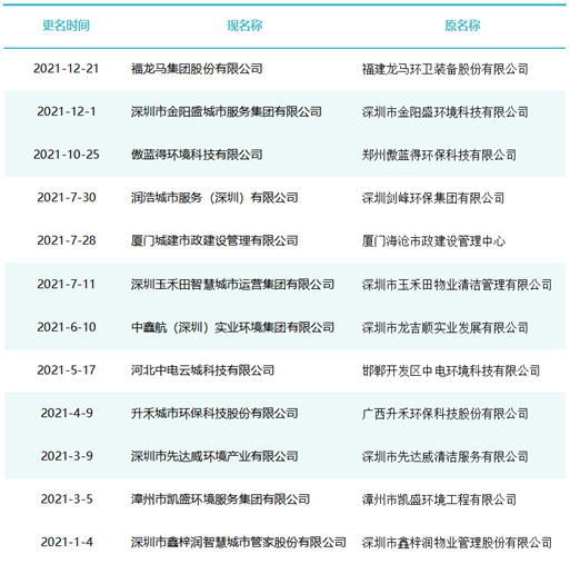 這期間有40余家知名環(huán)衛(wèi)企業(yè)完成了更名,如僑銀城市管理股份有限公司、北控城市環(huán)境服務(wù)集團(tuán)有限公司、深圳玉禾田智慧城市運營集團(tuán)有限公司、深圳市鑫梓潤智慧城市管家股份有限公司、康潔科技集團(tuán)有限公司、西安高科城市服務(wù)管理有限責(zé)任公司、溫州市鹿城區(qū)城市管理服務(wù)有限公司、廣東路通公用事業(yè)管理集團(tuán)有限公司、深圳市金陽盛城市服務(wù)集團(tuán)有限公司。