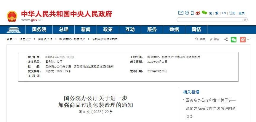 國務(wù)院辦公廳關(guān)于進(jìn)一步加強(qiáng)商品過度包裝治理的通知