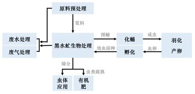 黑水虻處理濕垃圾工藝主要包括濕垃圾預處理系統(tǒng)、蟲卵培育孵化系統(tǒng)、養(yǎng)殖分離系統(tǒng)、污染控制系統(tǒng)等,基本情況如下: