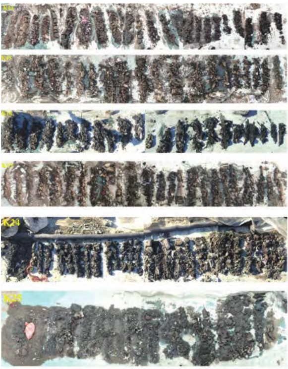 為制定陳腐垃圾綜合利用方案,2021 年對(duì)填埋場(chǎng)進(jìn)行場(chǎng)地調(diào)查。在填埋堆體上布設(shè)了 6 個(gè)采樣點(diǎn)位(K11、K15、K18、K19、K24、K25),根據(jù)采樣孔垃圾分層情況,每層采集 3 個(gè)樣品制成 1 個(gè)混合樣,保證每個(gè)點(diǎn)位 3 個(gè)混合樣,垃圾樣品按 10% 的比例采集現(xiàn)場(chǎng)平行樣,共采集垃圾混合樣品 18 個(gè)。帶回實(shí)驗(yàn)室后,每個(gè)點(diǎn)位的垃圾樣品制成 1 個(gè)最終混合樣。垃圾物理指標(biāo):容重、含水率、物理組成,垃圾樣品化學(xué)檢測(cè)檢測(cè)指標(biāo):pH值、有機(jī)質(zhì)、TN、TP、總鉀、重金屬(Cu、Zn、Pb、Hg、Cr、As、Cd)。