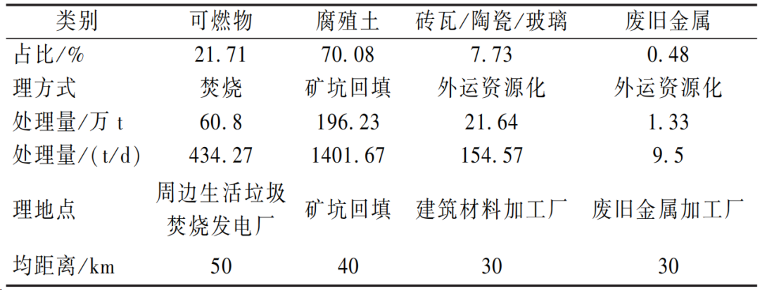 填埋場(chǎng)垃圾總量為 280 萬(wàn)t,其中紙類、橡塑類、紡織類、木竹類屬于可燃物,占比 21.71%,合 60.8 萬(wàn)t,磚瓦玻璃金屬為可直接資源化利用的比例為 7.73%,合 22.97 萬(wàn)t,混合類(腐殖土)占比 70.08%,196.23 萬(wàn)t(表4)。根據(jù)生活垃圾焚燒發(fā)電廠規(guī)模進(jìn)行反推,每天可處理可燃物 600 t,占處理規(guī)模的 21.71%,考慮不確定性因素,每天開(kāi)挖和篩分規(guī)模定為 2000 t。