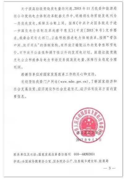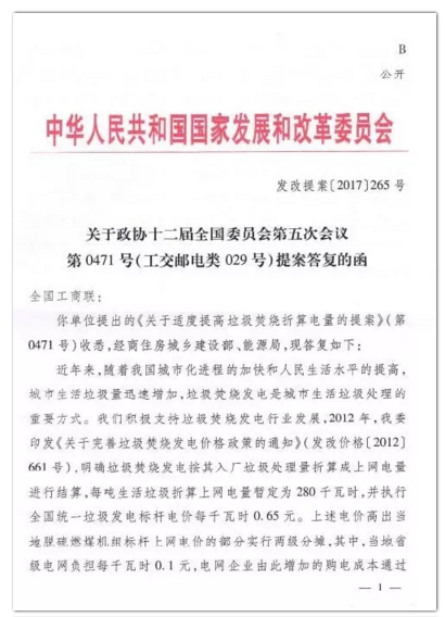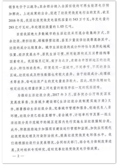 今年年初,環(huán)境商會(huì)以全國(guó)工商聯(lián)團(tuán)體提案的形式向兩會(huì)遞交《關(guān)于適度提高垃圾焚燒折算電量的提案》,國(guó)家發(fā)改委于9月正式答復(fù)。
