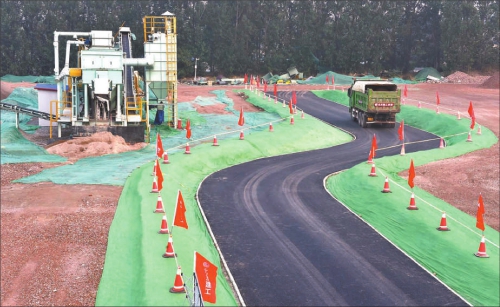 一輛運輸車行駛在建筑垃圾資源化處置項目內(nèi)的“環(huán)保路”上。這條“環(huán)保路”由棚改建筑垃圾生產(chǎn)的材料鋪筑而成。新華社記者羅曉光攝