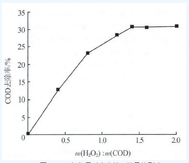 由圖 1 可見,隨著H2O2投加量的增加,COD 的去除率逐漸增加,m(H2O2)∶m(COD)=1.4 時(shí),COD 的去除率達(dá)到30.7%,當(dāng)m(H2O2)∶m(COD)由1.4 增至2.0 時(shí),COD 去除率僅增加0.1%,H2O2利用率顯著降低。綜合考慮,選擇m(H2O2)∶m(COD)=1.4。
