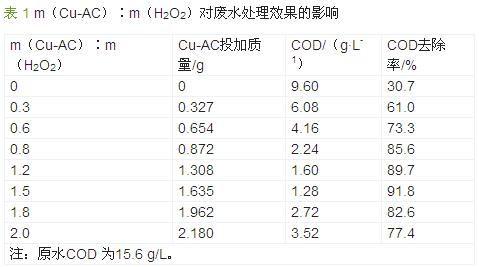為了考察Cu -AC 與H2O2的協(xié)同作用,在m(H2O2) ∶m(COD) =1.4,反應(yīng)溫度為30 ℃的條件下,改變Cu-AC 投加量,試驗(yàn)研究了m(Cu-AC)∶m(H2O2)對廢水處理效果的影響,結(jié)果見表 1。
