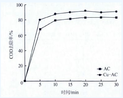 結(jié)果表明,Cu-AC 與AC 對COD 的去除率均隨時(shí)間的延長而提高,但Cu-AC 較AC 有更好的催化氧化效果,反應(yīng)30 min 時(shí)COD 去除率趨于穩(wěn)定。