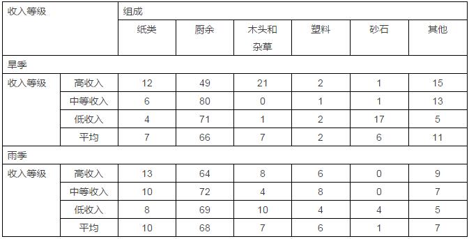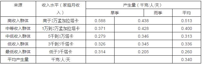 在達(dá)卡市,廢物的產(chǎn)生按重量計(jì)算,存在旱季和雨季的差別:在雨季,包括有機(jī)廢物在內(nèi)的各類能夠降解的廢物含有更多的水分,所以重量與旱季時(shí)相比會(huì)更大。此外,不同收入水平的人群廢物的產(chǎn)生量也存在極大的差異:收入最高人群的人均廢物產(chǎn)生量幾乎是收入最低人群的兩倍。