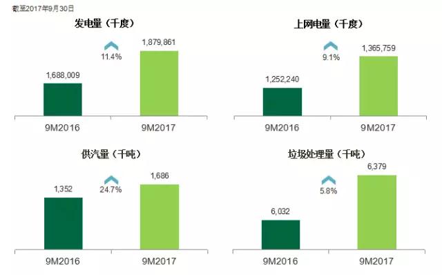 2017年前三季度,集團共計處理生活垃圾量638萬噸,較2016年同期增加5.8%。與去年同期相比,集團供電量以及供汽量增幅較大,分別增長9.1%,24.7%。主要得益于運營項目總處理量穩(wěn)定上升,加上新項目、改擴建項目的投入運作,提升可運營服務效益。