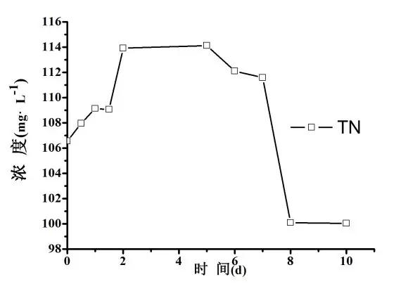 欽州小欖江水中氮的轉(zhuǎn)化如圖4所示。在培養(yǎng)過程中氨氮的變化分成兩個階段:第一階段為氨氮升高階段(0~5 d),在此階段,污水中的氨氮濃度由初始的105.73 mg/L升至5 d時的113.58 mg/L,加入菌液的污水中氨氮和總氮均升高,原因可能是菌液中部分細(xì)菌死亡,釋放出氨氮,導(dǎo)致污水中的氨氮和總氮升高;第二階段為氨氮下降階段(5~10 d),污水中的氨氮濃度由5 d時的113.58 mg/L降至10 d時的98.97 mg/L,與此同時,5~10 d內(nèi),水中的硝態(tài)氮沒有明顯變化,而亞硝態(tài)氮由0.05 mg/L增長至0.37 mg/L。根據(jù)加入菌液后總氮的變化(如圖5所示)得出,水中減少的氨氮部分轉(zhuǎn)化為NO2--N,另一部分極可能轉(zhuǎn)化為氮氣,轉(zhuǎn)化量為6.44 mg/L。